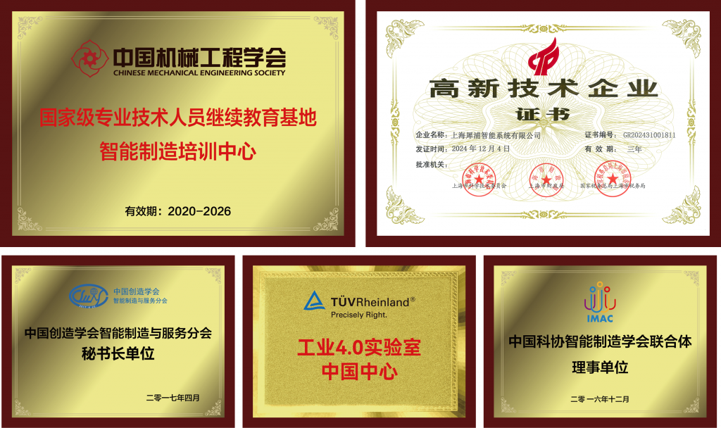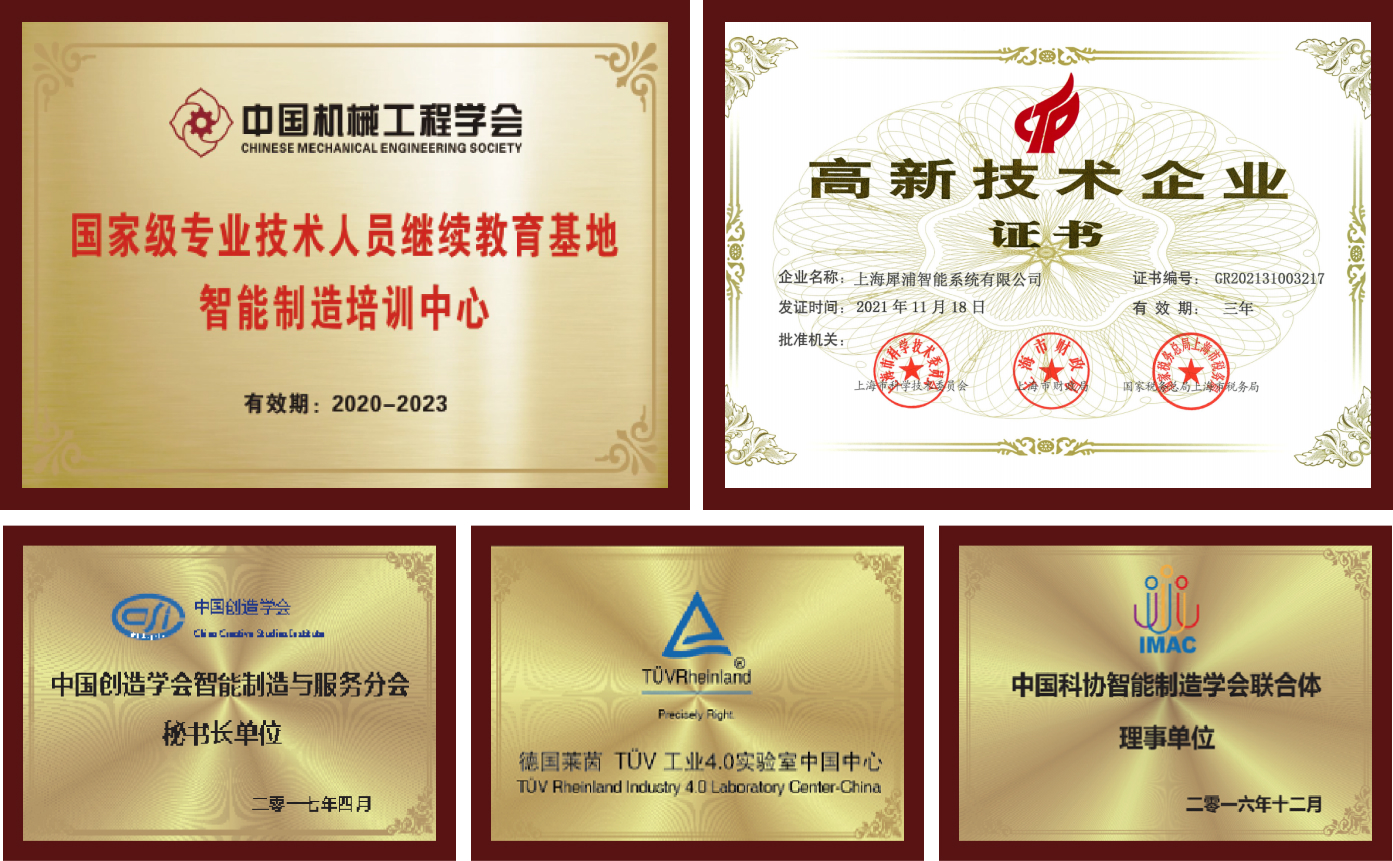中德政府间智能制造企业对话工作组-未来职业组中方秘书处及专家成员单位、国家级专业技术人员继续教育基地-智能制造培训中心 、中国创造学会智能制造与服务分会常务理事及秘书长单位 、中国科协智能制造学会联合体理事单位、德国莱茵TÜV工业4.0实验室中国中心、上海市高新技术企业、上海市“专精特新”中小企业